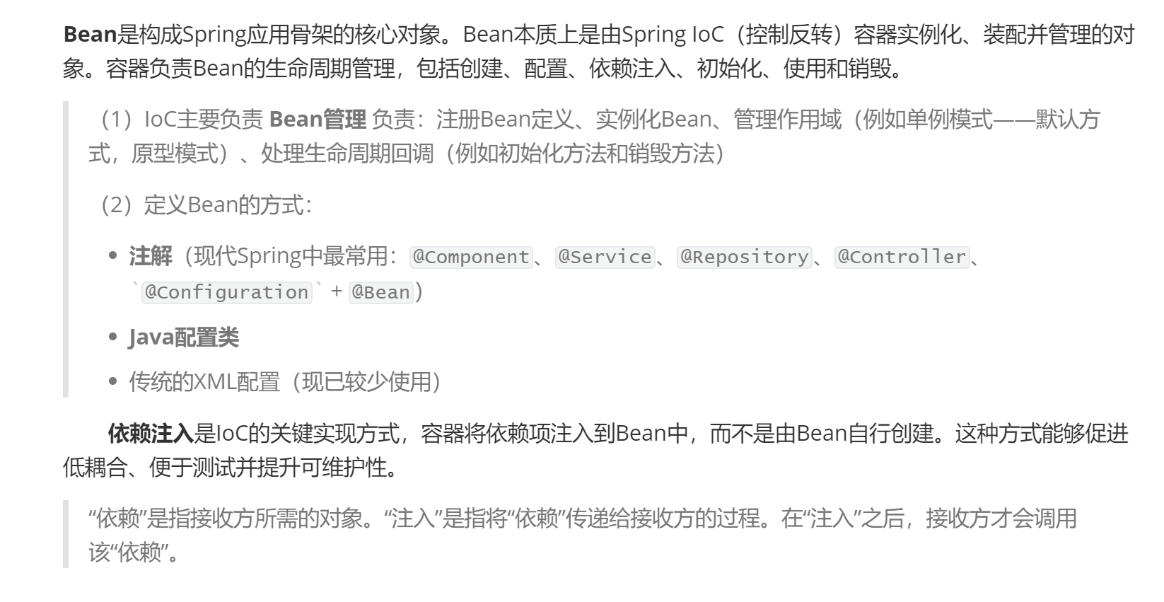- Bean 管理:Spring 容器负责创建、管理和销毁 Bean