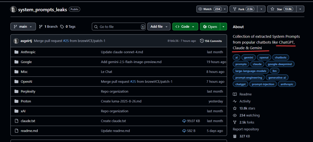 两眼一睁,就看到了这个新增了 2634 个star ⭐ 的项目 —— system_prompts_leaks