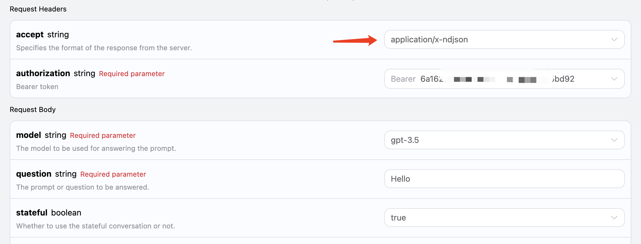 payload = { "model": "gpt-3.5", "stateful": True, "id": "7cdb293b-2267-4979-a1ec-48d9ad149916", "question": "Hello" }