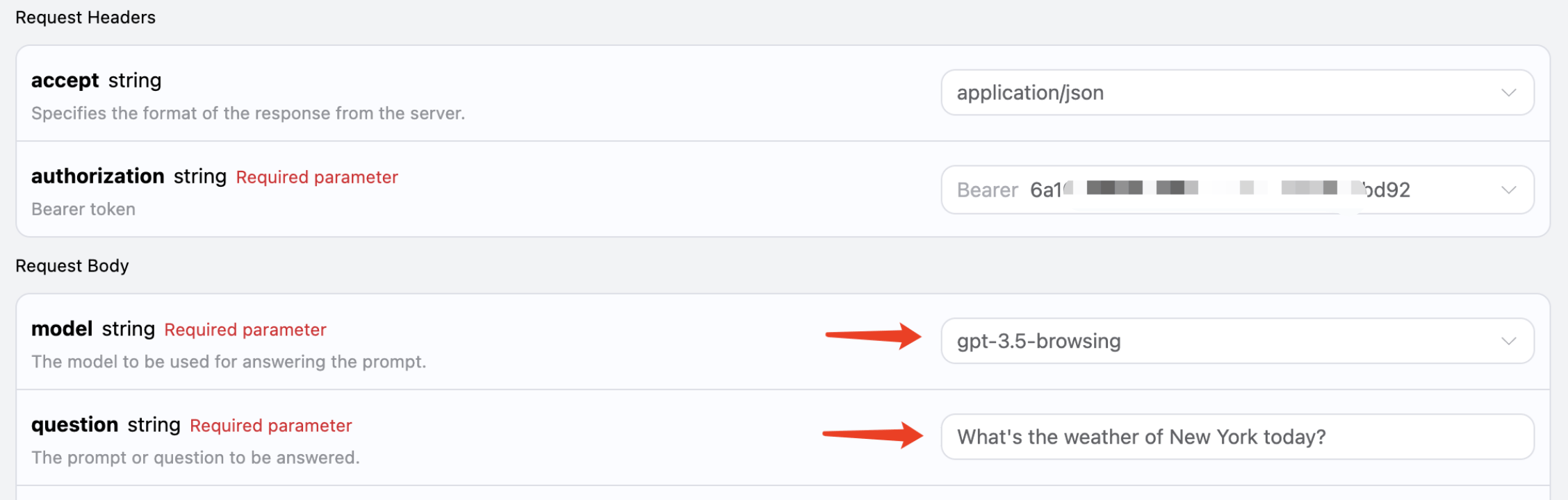 model:模型的选择,比如主流的 GPT 3.5,GPT 4 等。question:需要询问的问题,可以是任意的纯文本。