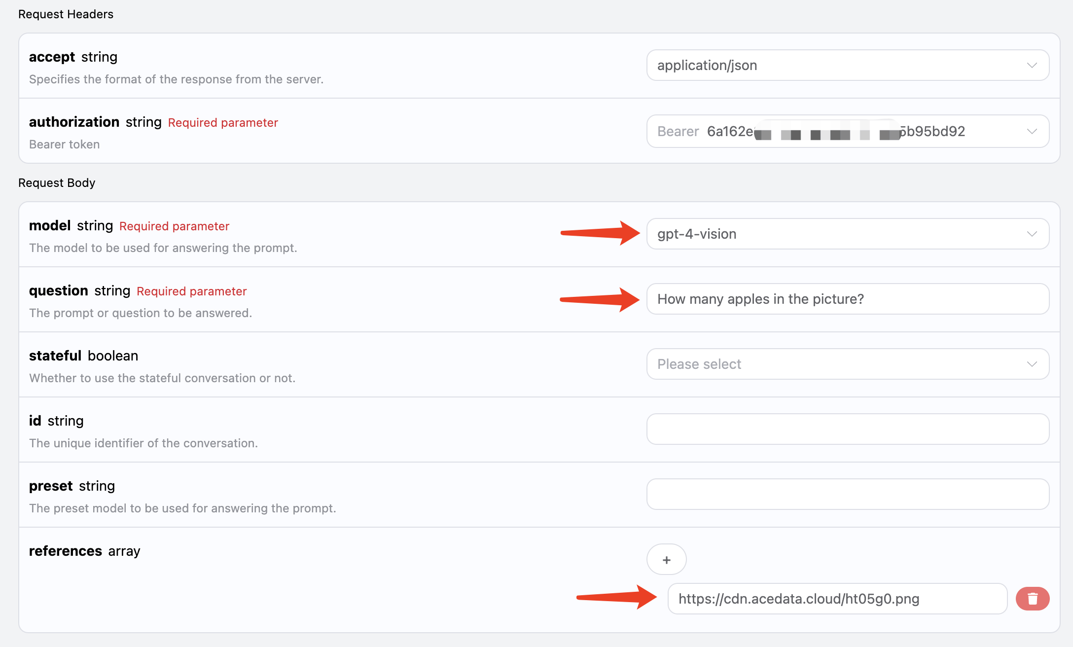 shell curl -X POST 'https://api.acedata.cloud/aichat/conversations' \ -H 'accept: application/json' \ -H 'authorization: Bearer {token}' \ -H 'content-type: application/json' \ -d '{ "model": "gpt-4-vision", "question": "How many apples in the picture?", "references": ["https://cdn.acedata.cloud/ht05g0.png"] }'