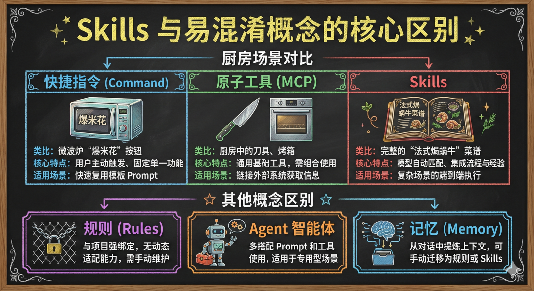 为了更清晰理解 Skills 的价值,我们通过 “厨房场景” 对比它与快捷指令(Command)、原子工具(MCP)的差异: