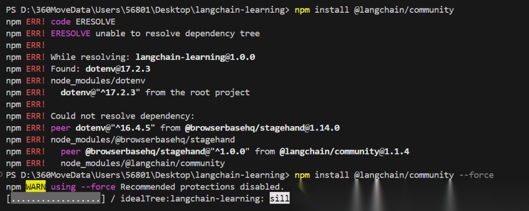 遇到 npm 底层依赖冲突,直接加 --force 安装。