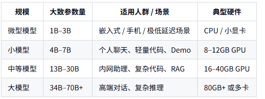 对绝大多数实际业务:7B–13B 档的模型已经能覆盖大量应用场景,70B 通常只在资源很富裕、对效果要求极高时才会用。
