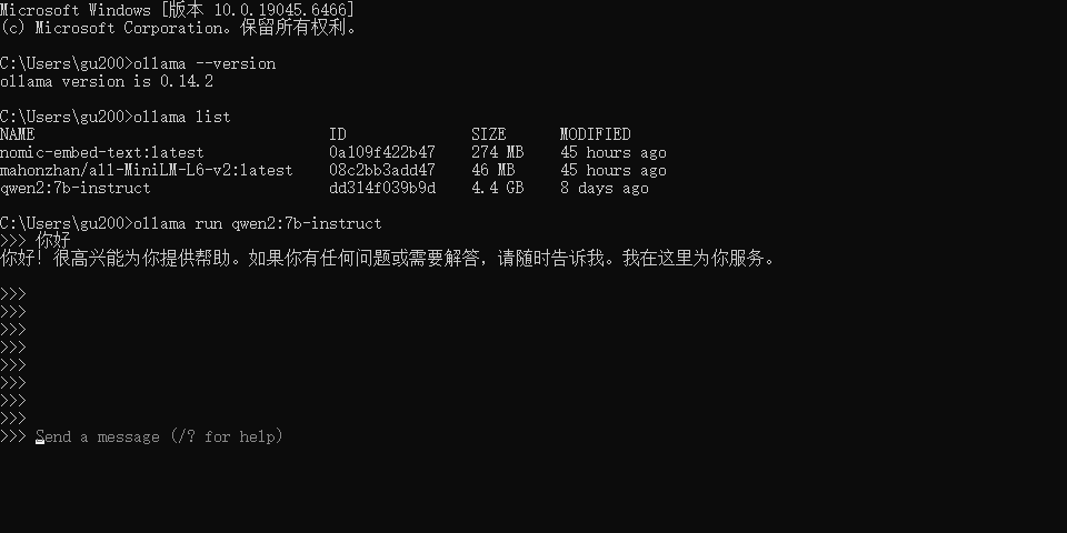 ollama run qwen2:7b-instruct,进入模型对话界面,输入「你好」,若能收到正常回复,说明 Ollama 服务运行正常(输入/bye可退出对话界面)。