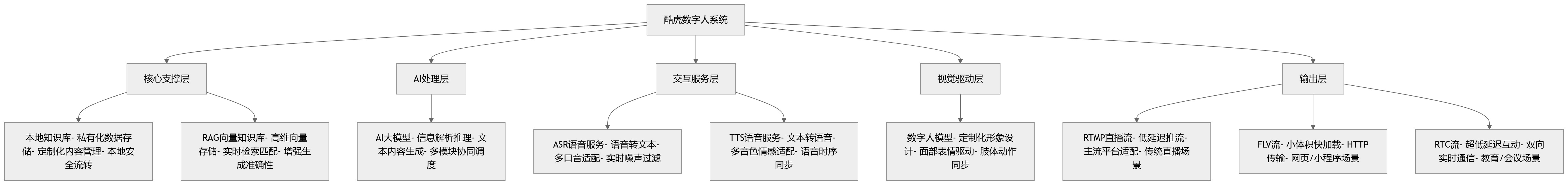 酷虎数字人系统是一套集成语音处理、AI计算、数字人驱动及流媒体输出的全链路智能系统,核心依托本地知识库、RAG向量知识库、AI大模型、语音服务(ASR/TTs)、数字人模型五大核心模块,通过协同工作将输入信息转化为可实时分发的直播流,最终输出RTMP、FLV、RTC三种主流流媒体格式,适配不同直播、互动场景需求。以下从模块解析、工作流程、树型结构三方面展开详细说明。