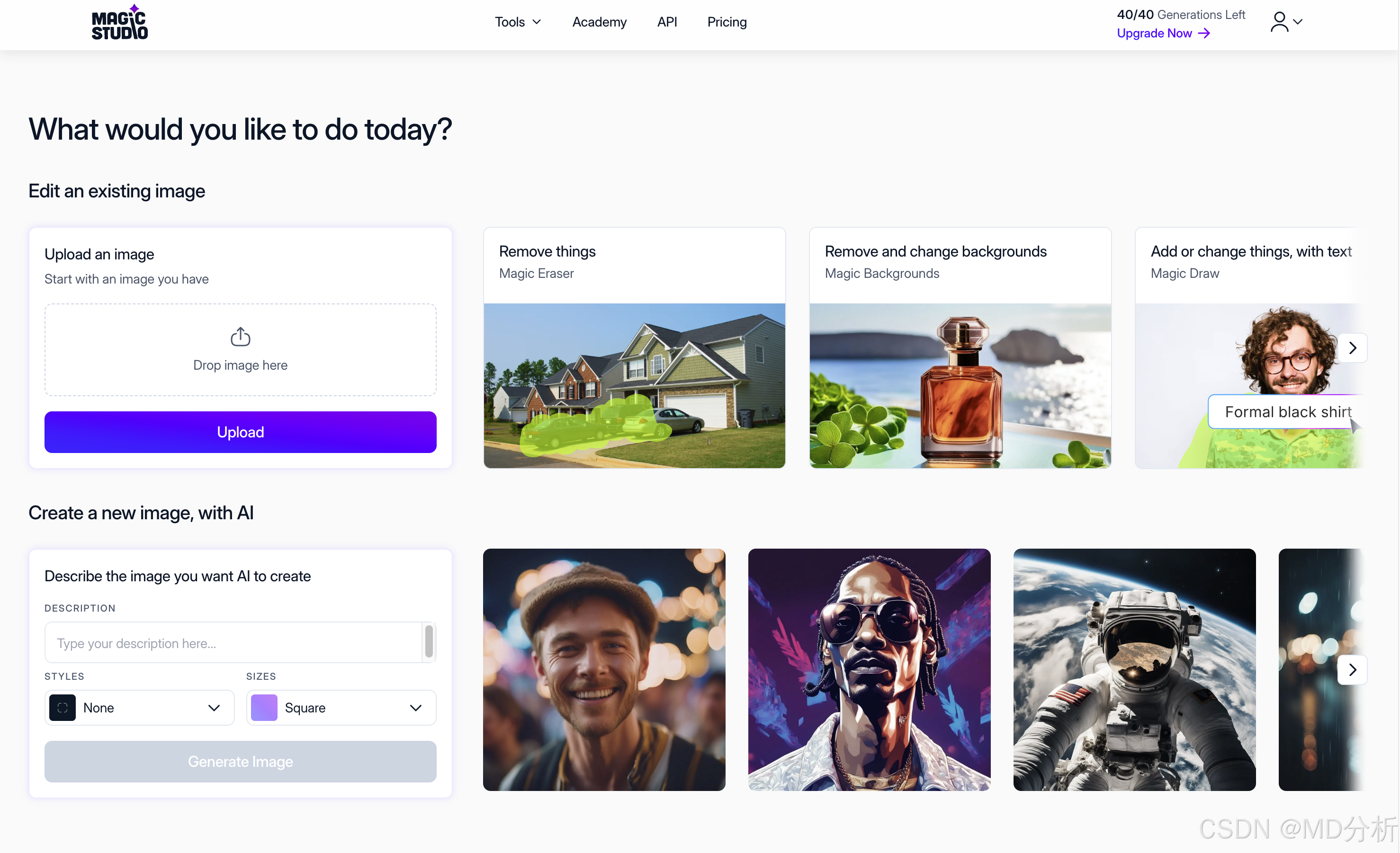 2)Magic Studio 主打极速生成,可生成海量图像,并宣称月度额度达百万级,适合大量试验性任务。它的亮点在于高效完成“风格转换”任务,并支持下载生成图片用于商业使用。