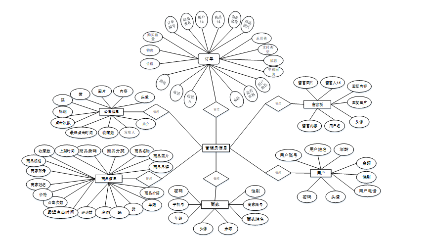 概念模型是对现实中的问题出现的事物的进行描述,ER图是由实体及其关系构成的图,通过E-R图可以清楚地描述系统涉及到的实体之间的相互关系。本文将“用户、商家、订单、商品信息、留言板、公告信息”等作为实体,它们的局部E-R图,如图4-2所示: