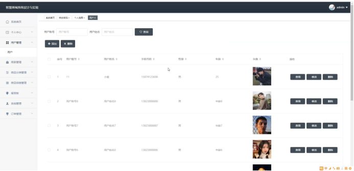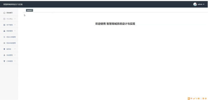 管理员进入主页面,主要功能包括对个人中心、用户管理、商家管理、商品分类管理、商品信息管理、留言板、系统管理、订单管理等进行操作。管理员主页面如图5-6所示: