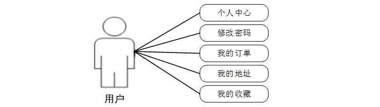 (3)、用户注册登录系统首页点击个人中心可以对个人中心、修改密码、我的订单、我的地址、我的收藏等进行管理。用户用例如下: