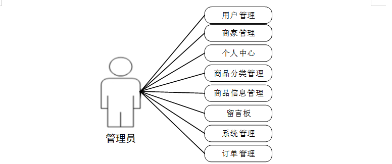 (1)、管理员关键功能包含个人中心、用户管理、商家管理、商品分类管理、商品信息管理、留言板、系统管理、订单管理等进行管理。管理员用例如下:
