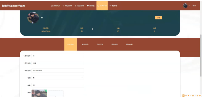 个人中心,在个人中心页面输入个人信息可以进行更新操作,还可以对个人中心、修改密码、我的订单、我的地址、我的收藏进行操作;如图5-4所示: