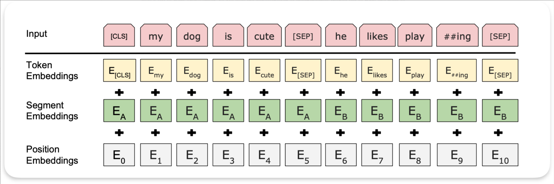 每个 token 的最终输入为:Input=Token Emb + Segment Emb + Position Emb