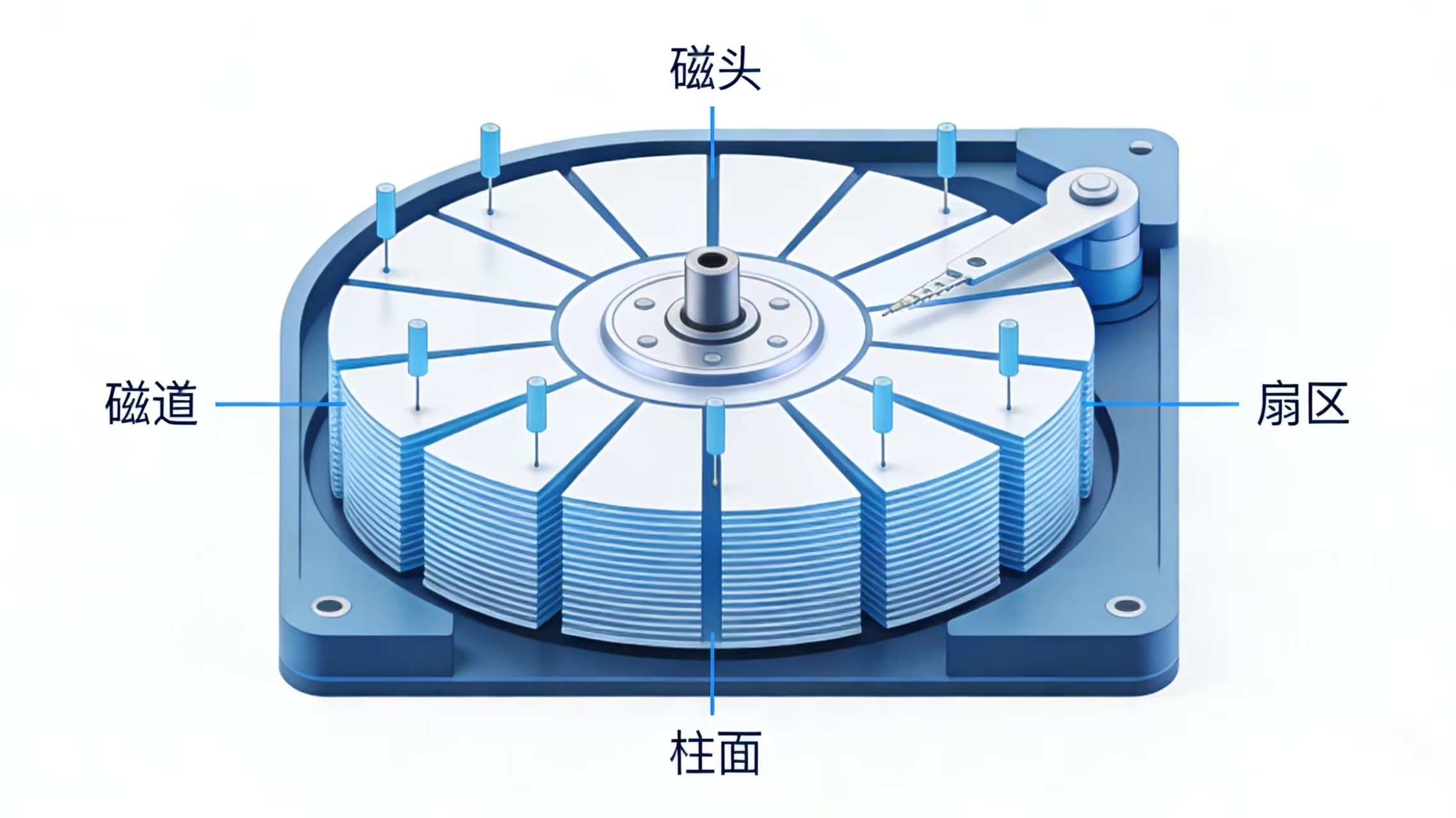 硬盘(Hard Disk Drive, HDD)由盘片、磁头、电机、控制电路等组成,数据存储在盘片的磁道、扇区和柱面中: