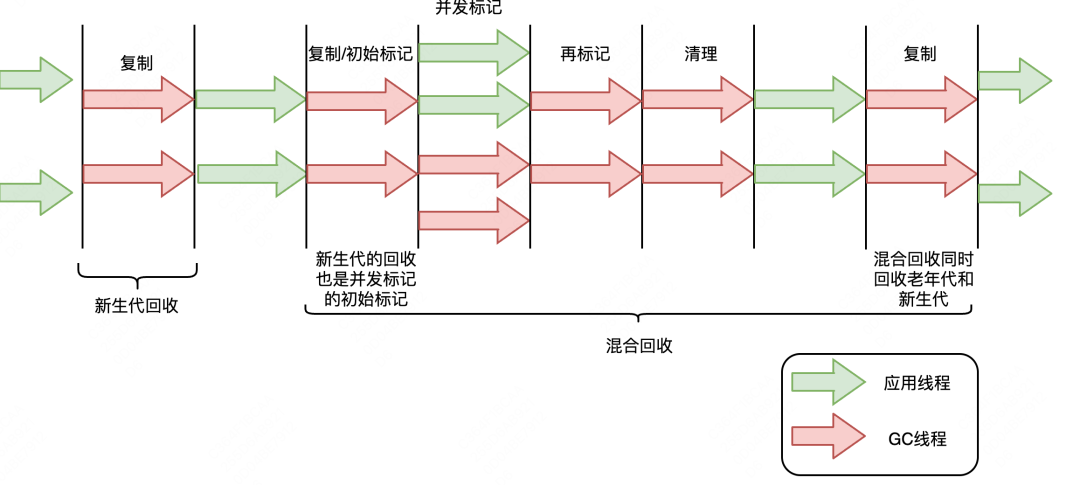 下面以G1为例,通过G1中标记-复制算法过程(G1的Young GC和Mixed GC均采用该算法),分析G1停顿耗时的主要瓶颈。G1垃圾回收周期如下图所示: