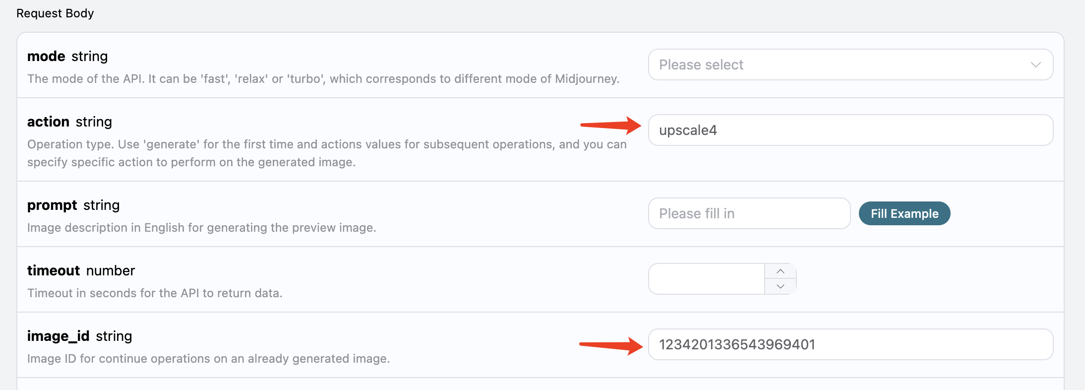 这时候我们可以挑选其中一张进行精细化地放大操作,比如选第四张,那就可以 action 传入 upscale4,通过 image_id 再次传入当前图像的 ID 即可。