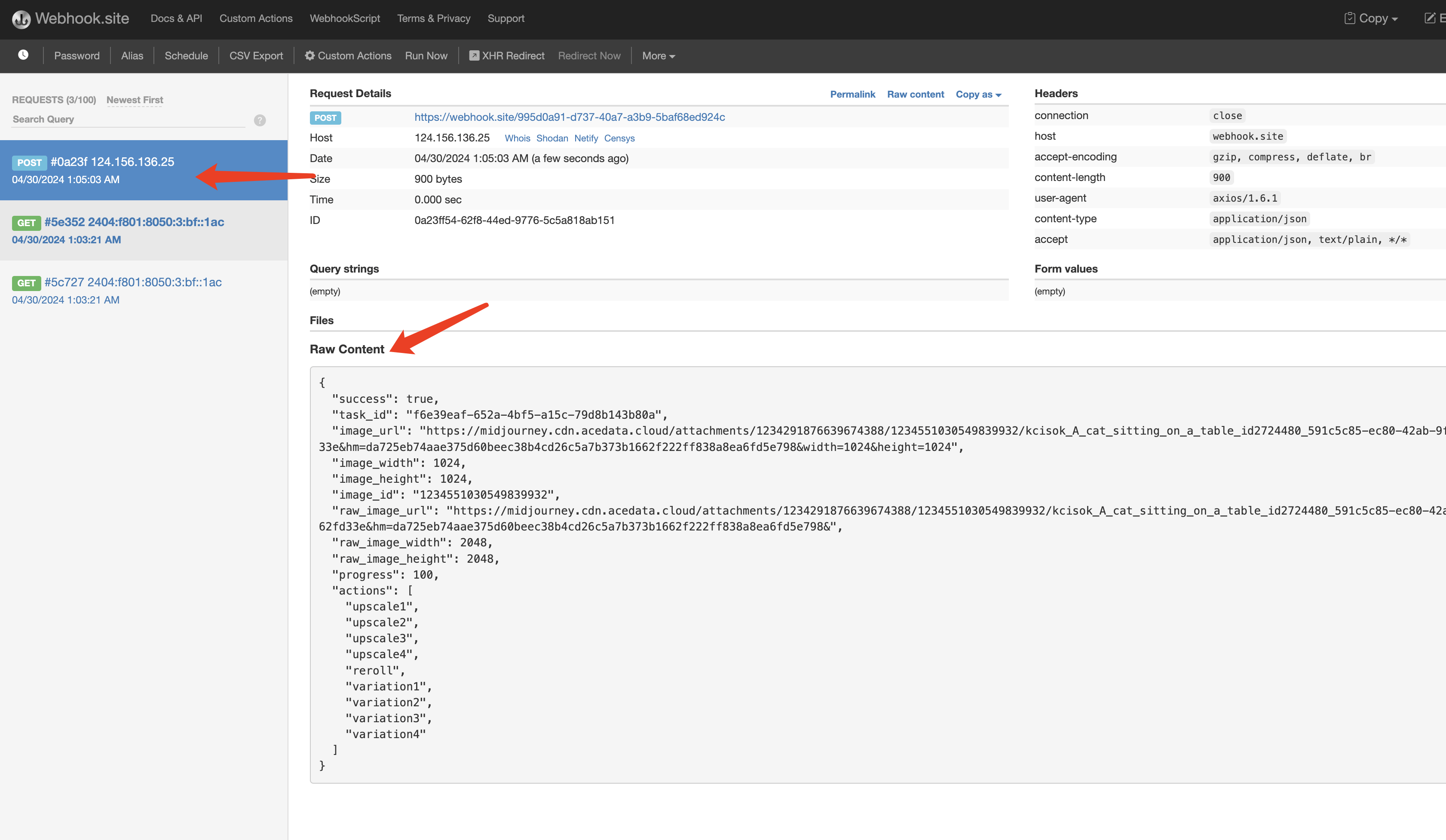 稍等片刻,等图片生成结束,可以发发现 Webhook URL 收到了一个 HTTP 请求,如图所示: