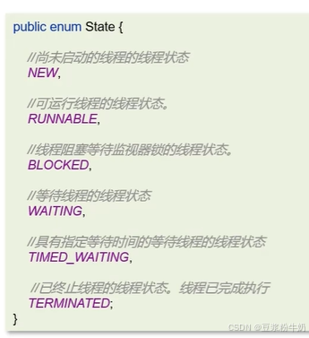 线程状态包括: 新建(new), 可运行(RUNNAbLE), 阻塞(BLOCKED),等待(WAITNG),时间等待(TIME_WALTING),终止(TERMINATED)。