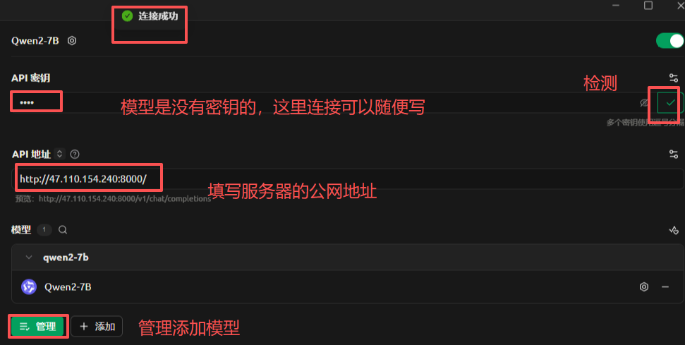 开放安全组,把服务器的8000端口,添加本地电脑的准入;使用cherry studio 配置连接(也可以使用webui或chartbox等工具)