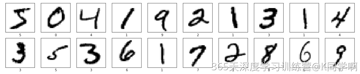 代码可以帮助可视化MNIST数据集的前20张图片。