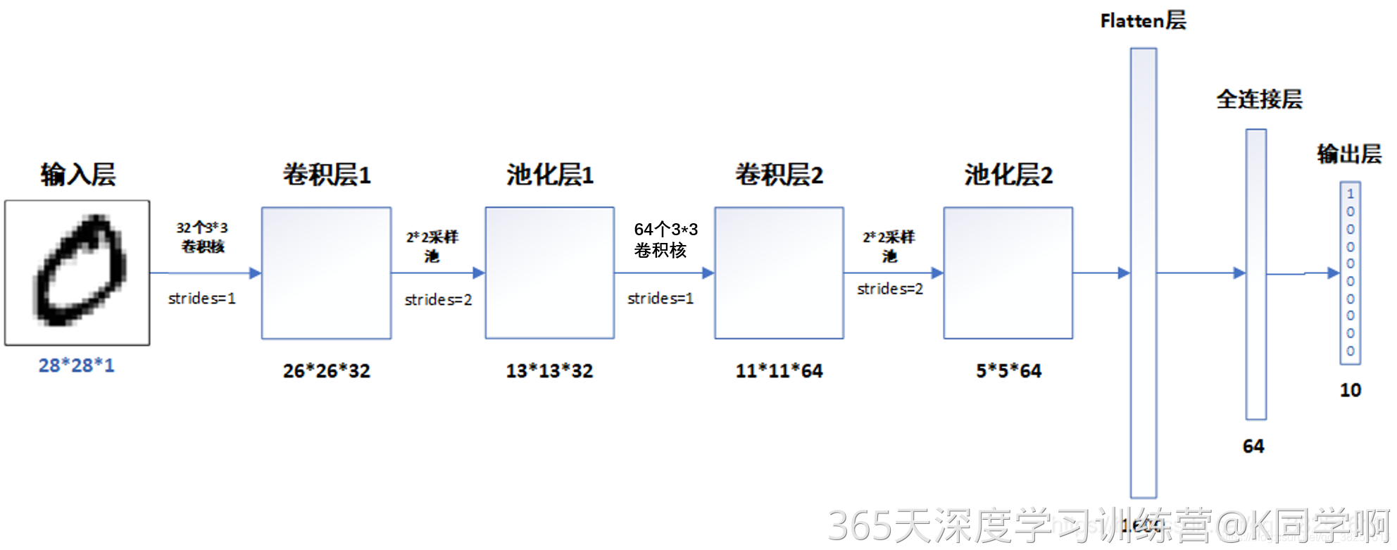 第一层:Conv2D,32个3x3的卷积核,使用ReLU激活函数,输入形状为(28,28,1)