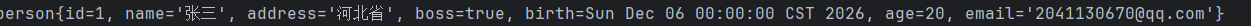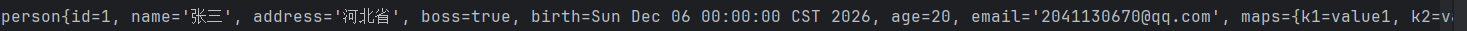 @Component public class person { @Value("${person.id}") private Integer id; @Value("${person.name}") private String name; @Value("${person.address}") private String address; @Value("${person.boss}") private boolean boss; @Value("${person.birth}") @DateTimeFormat(pattern = "yyyy/MM/dd") private Date birth; @Value("${person.age}") private Integer age; @Value("${person.email}") private String email; //getter/setter //toString