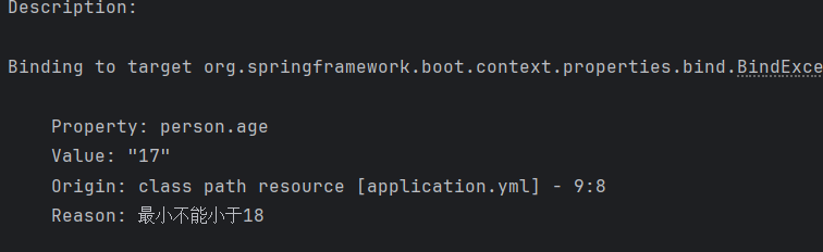 实体类里设置的最小年龄为18,yml里写的是17所以启动报错