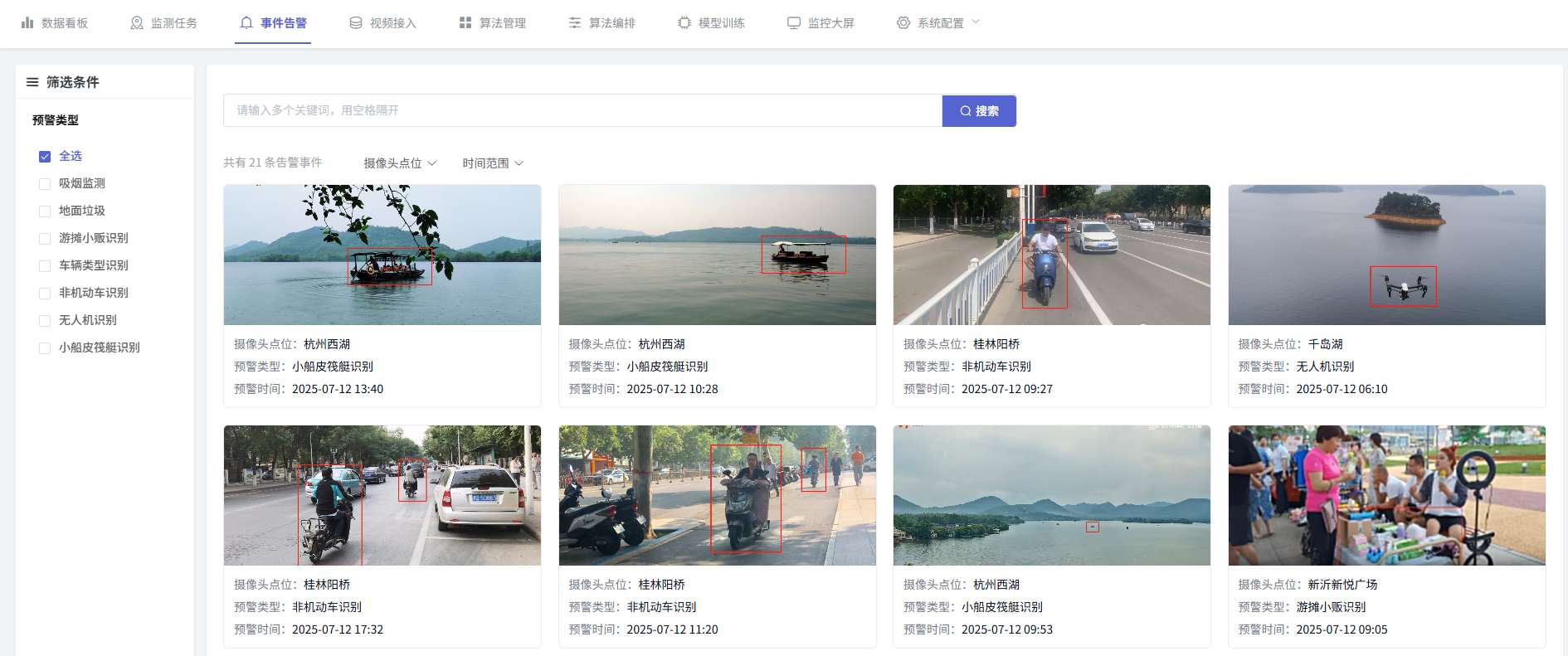 视频内容检索:支持关键词、摄像头点位和时间范围组合检索,快速定位目标视频