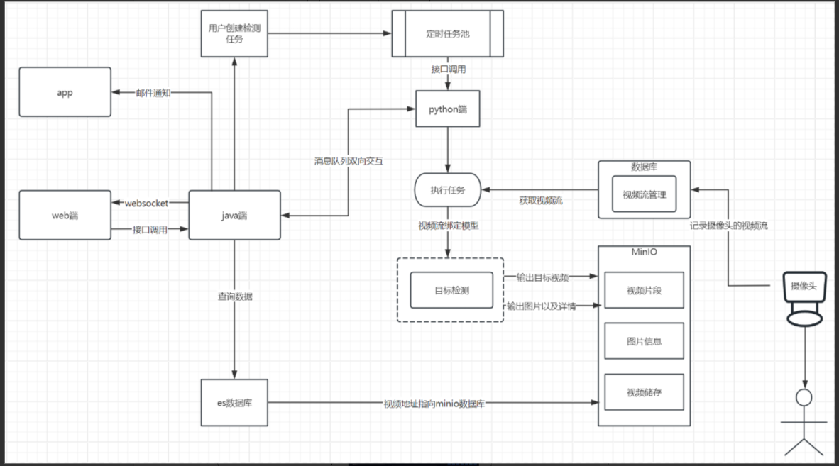系统架构: 通过摄像头捕获数据,交给算法进行处理,对摄像头的内容进行判断,发现违规事件进行记录并且给用户实时推送。