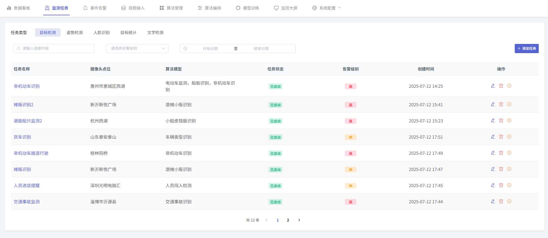 添加监测任务:支持多参数配置,可将任务分配至单个或多个摄像头,实现灵活调度