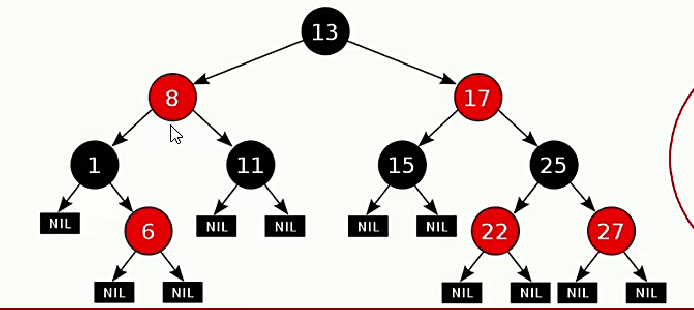 - 如果一个节点没有子节点或者父节点,则该节点相应的指针属性值为Nil,这些Nil视为叶节点,每个叶节点(Nil)是黑色的