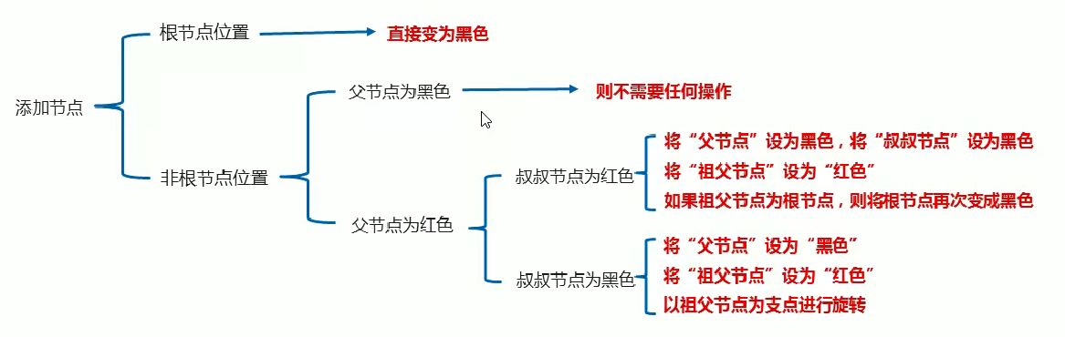 - 根节点必须是黑色(与第三点的一个节点没有父节点相对应)