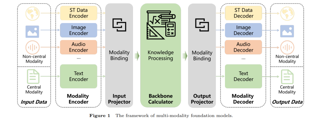根据当前关于基础模型的前沿研究,广泛认为多模态基础模型能够涵盖单模态基础模型的所有功能和结构。实质上,单模态基础模型只实现了多模态基础模型功能的一部分。本文提出的五模块框架有效地涵盖了以语言为中心模态的多模态基础模型架构。然而,随着非语言基础模型的出现,包括视觉基础模型[13,14]、图基础模型[28,29]、时间序列基础模型和时空基础模型[32,33],基础模型的骨干结构正在超越语言模态。因此,我们提出多模态基础模型的结构可以分为以下五个模块:模态编码器、输入投影器、骨干计算器、输出投影器和模态解码器。图1展示了以语言为中心模态的多模态基础模型框架。
