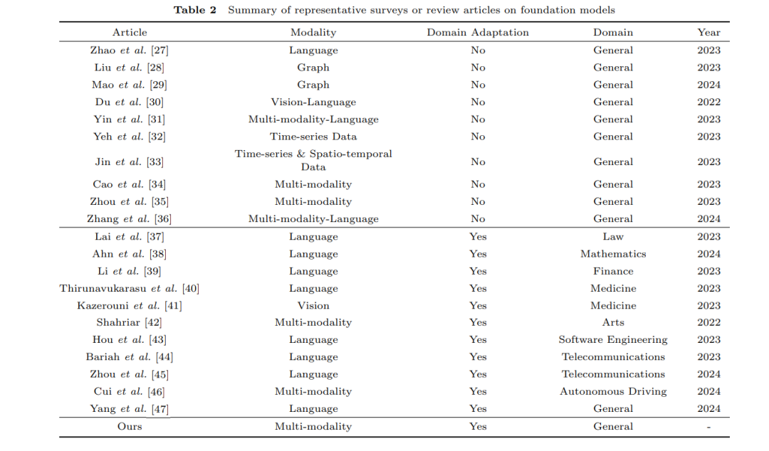 值得注意的是,之前的综述文章主要集中在通用基础模型的发展上。尽管最近一些综述文章开始探索基础模型的领域特定适配,但在文献中,缺乏对适用于各种模态基础模型的适配策略的全面探讨,这些策略不仅限于语言、视觉或任何单一模态,还涉及到多个应用领域。我们在表2中总结了关于基础模型的代表性调查或综述文章。本文旨在为有兴趣构建领域特定基础模型应用的研究人员和从业者提供方法论参考,并讨论实际案例和未来的研究方向。