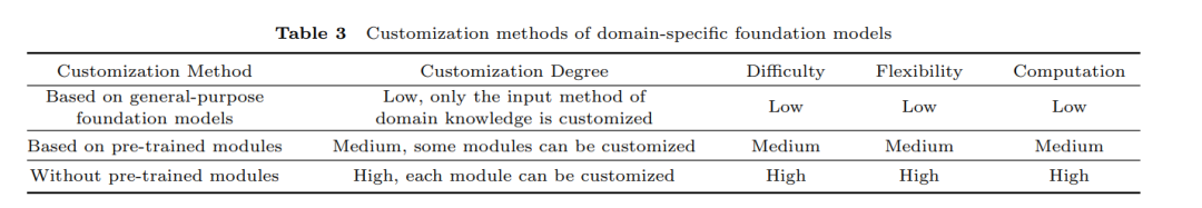 表3总结了这三种领域特定基础模型定制化方法的特征。