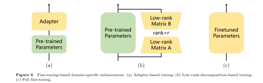 微调技术可以分为三种主要类型:基于适配器的微调、基于低秩矩阵分解的微调和全参数微调。图6 (a)、(b) 和 © 分别展示了这三种技术路径。