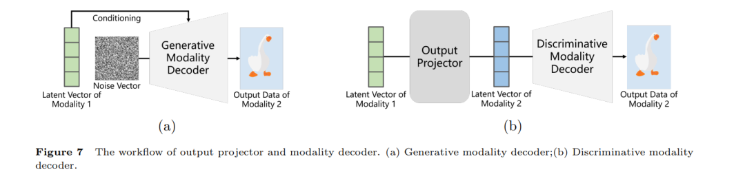 多模态基础模型则需要额外的输入投影器和输出投影器来实现模态对齐。例如,CoDi-2 [21] 首先利用ImageBind [25] 中提出的多模态编码器来处理输入数据,将所有相应的模态对齐到图像模态。然后,通过多层感知机(MLP)将图像模态的特征向量转换为语言模态的特征空间。具体来说,它使用预训练的自回归Transformer LLM LLaMA-2-7b-chat-hf 作为骨干计算器的基础。骨干计算器处理的图像和音频特征通过两个MLP转换回图像领域,并作为基于扩散的生成模型的控制向量输入,最终获得图像和文本结果。训练损失包括文本生成损失、模态转换损失和数据生成损失。因此,骨干计算器的多模态特征处理能力和两个MLP的模态转换能力可以通过端到端的方式同时进行训练。模型的模态对齐体现在两个方面。一方面,模型通过ImageBind的预训练模态编码器将多模态特征向量对齐到图像模态。另一方面,它还通过MLP在图像特征向量和文本特征向量之间进行转换。