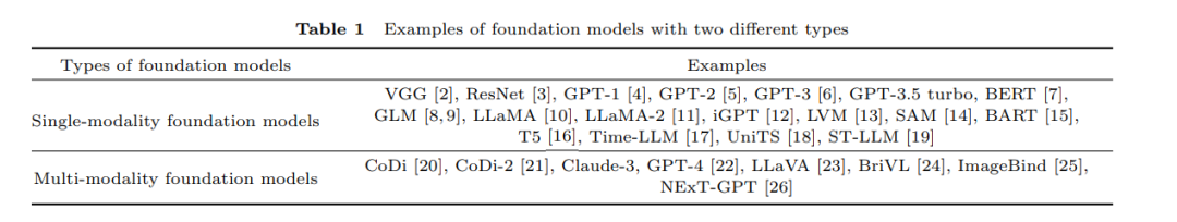 根据基础模型能够处理的模态数量,它们可以分为单模态基础模型和多模态基础模型,如表1所示。