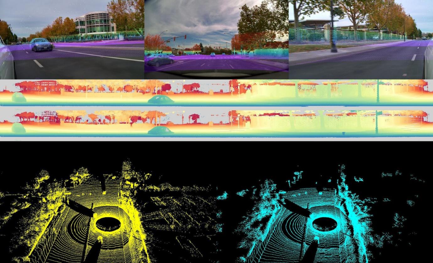 此为基于 Cosmos 构建的 LidarGen 模型输出示例。上方图片展示了叠加生成激光雷达数据的输入数据。中间图像呈现了生成与真实激光雷达距离图对比。左下角为真实激光雷达点云,右下角则展示了由 LidarGen 生成的点云。