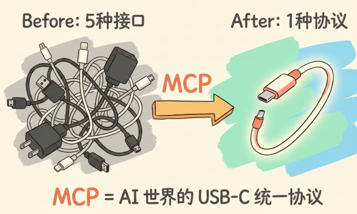 2024 年 11 月,Anthropic 开源了 MCP(Model Context Protocol,模型上下文协议)。它做的事情,和 USB-C 统一充电接口一模一样:定义一套标准协议,让任何 AI 都能即插即用地连接任何工具。