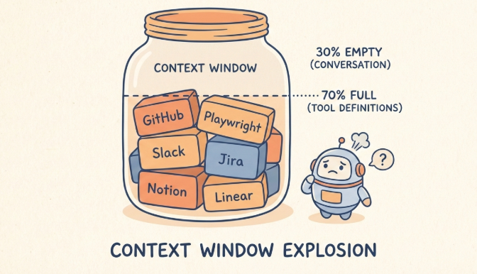 有开发者配了 7 个 MCP Server,还没开始对话,上下文就被吃掉了 67,000 tokens——占 AI 上下文窗口的 33%。更夸张的案例是 82,000 tokens,占 41%。