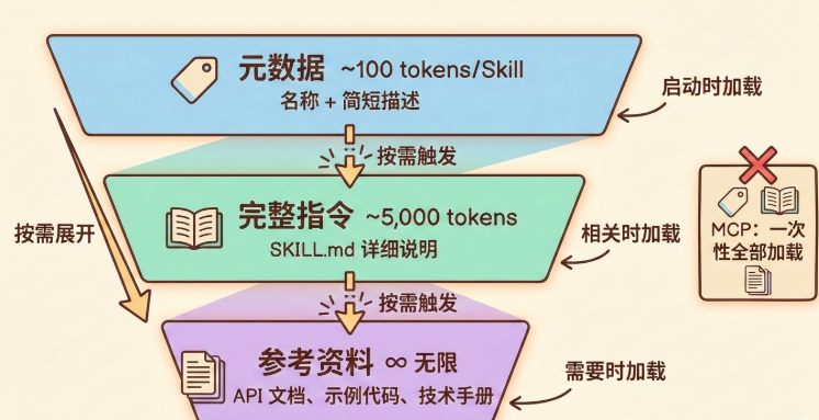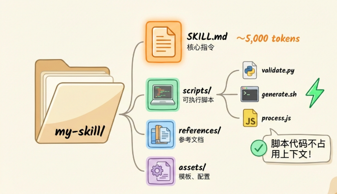 这正是 Skills 的设计方向:用脚本封装能力,用渐进式披露管理知识,最大限度减少上下文消耗。