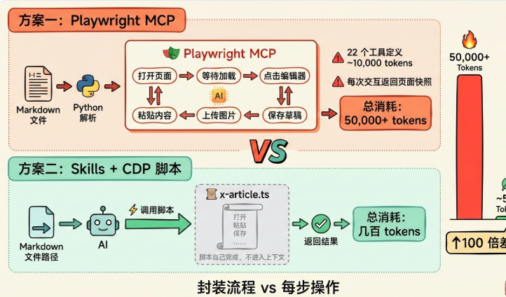 发布一篇文章,可能需要:打开页面、等待加载、点击编辑器、粘贴内容、上传图片、调整位置、保存草稿……每一步都是一次 MCP 交互,每一次交互都在消耗上下文。
