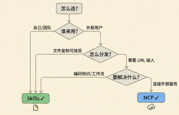 怎么分发? 如果可以接受“把文件放到某个目录”这种安装方式,用 Skills。如果希望用户输入 URL 就能用,用 MCP。