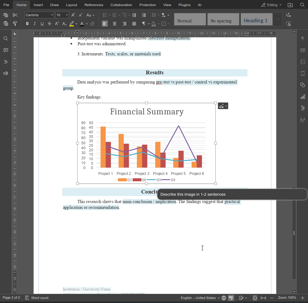 AI 描述图像的基本目标十分直观:选定文档中的一张图像,输入简要指令,然后得到由 AI 生成、写入到合适位置的文字。这个文字可以是图像标题、说明段落,也可以是面向辅助访问的替代文本。为了避免模型对用户意图做出模糊假设,这个功能依赖于明确的用户提示,从而确保生成结果与用户需求紧密对齐。