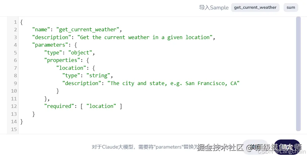- 大模型收到请求后,会自动判断是否需要调用这些函数,如果发现需要调用,则会将函数定义中规定的参数,返回给应用,如:“location”,即哪个地方的天气,或者其他更多的参数。