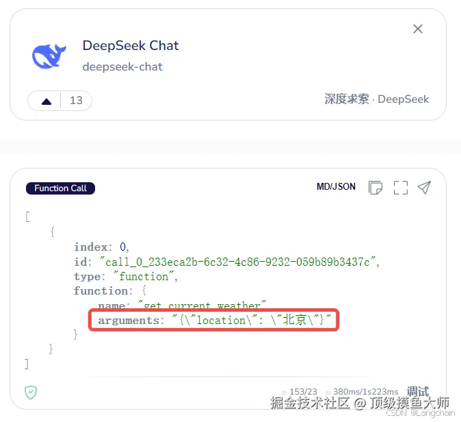 可以看到,大模型从我的提问中,了解到当前要查询天气,并且要查询的地区(location)是北京,所以返回给了我函数名称和地区