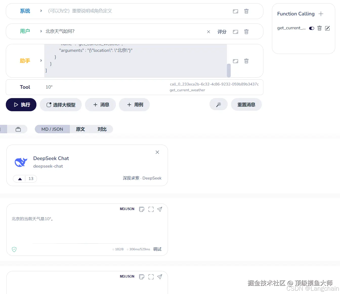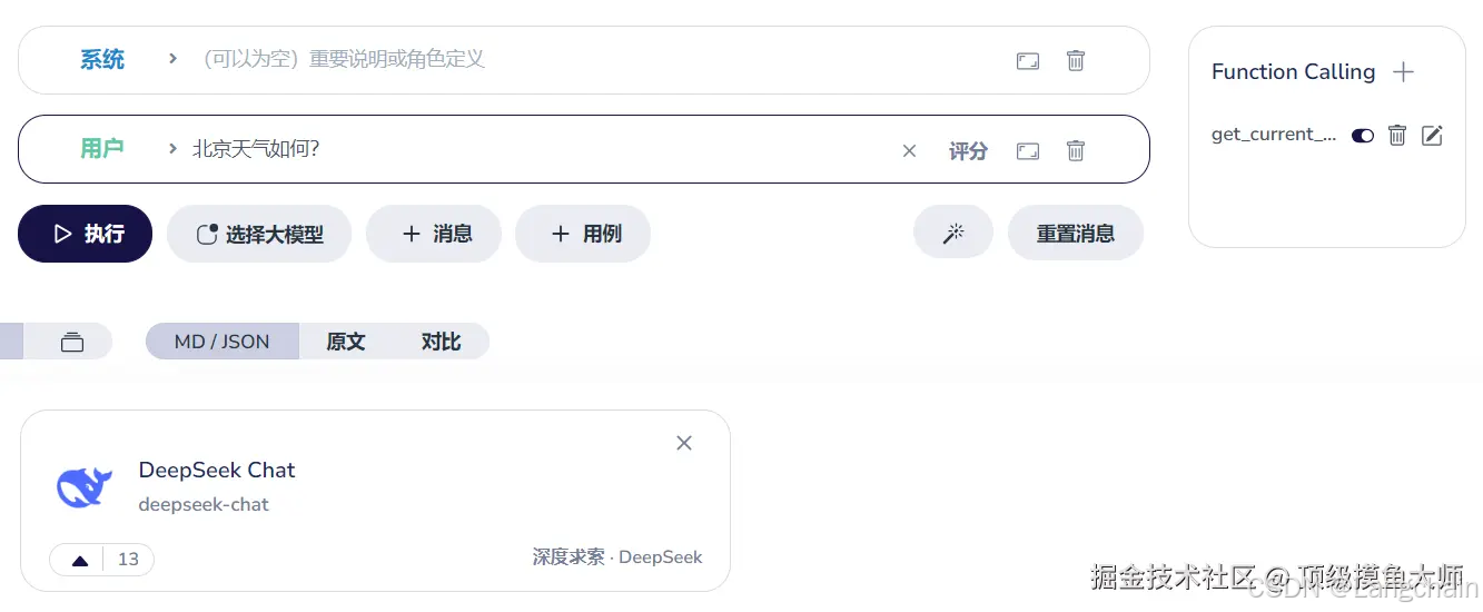 - 我们直接开始关注步骤 2,发送 Prompt 和 Function 定义,在大模型分发助手中,填写用户消息,并定义一个查询天气的函数,我们本次只选择一个大模型,DeepSeek(大模型间的 Function Calling 回复语法,很多存在差异,无法兼容)。