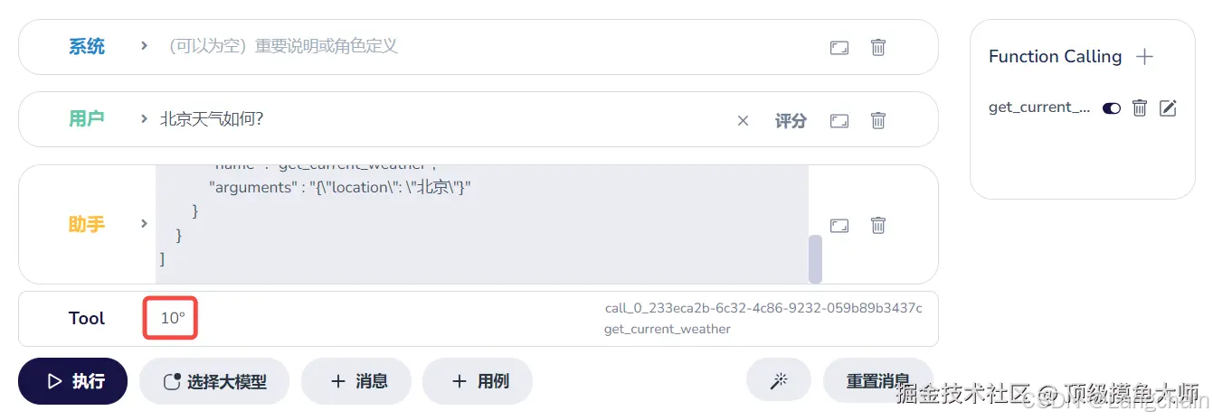 - 按照前面 Function Calling 流程图中的逻辑,我们该执行第 4 步“调用函数”了,就如前面说的,大模型分发助手并非是一款大模型应用,是协助学习的,这里自己将大模型的回复发送上去,并填上温度即可,而实际应用中使用时,需要调用 API 去获取这个信息。相当于我们直接完成了步骤 4 和 5。