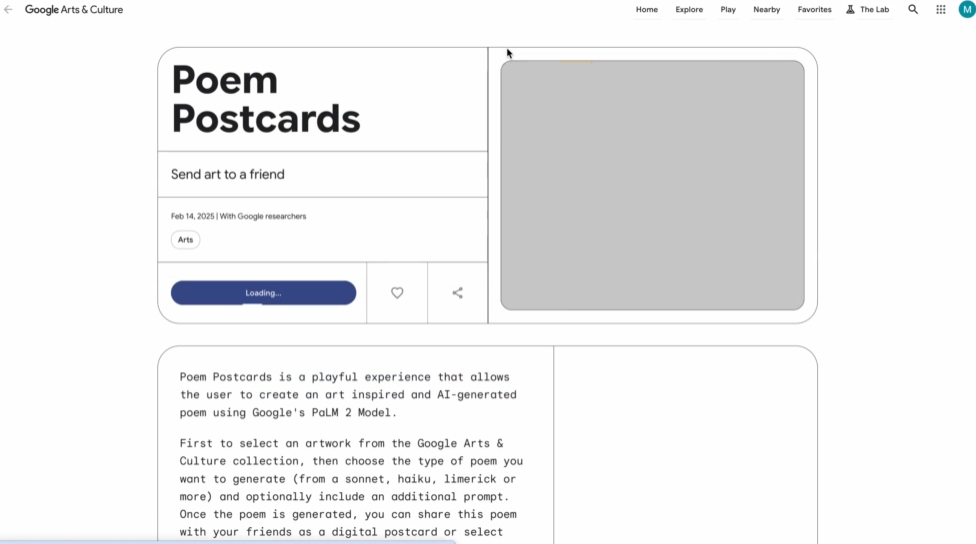 比如随意打开其中一幅作品,选择「PoemPostcard」按钮,就可以跳转至这个新项目,从十四行诗、自由体诗、打油诗等 6 种诗歌形式中选择喜欢的,AI 就能自动生成一首诗歌。